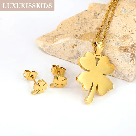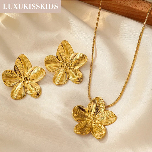 2PC Women's Fashion Trendy Stainless Steel Flower Earrings Necklace Set Gold-Plated Jewellry Party Dressing Gifts