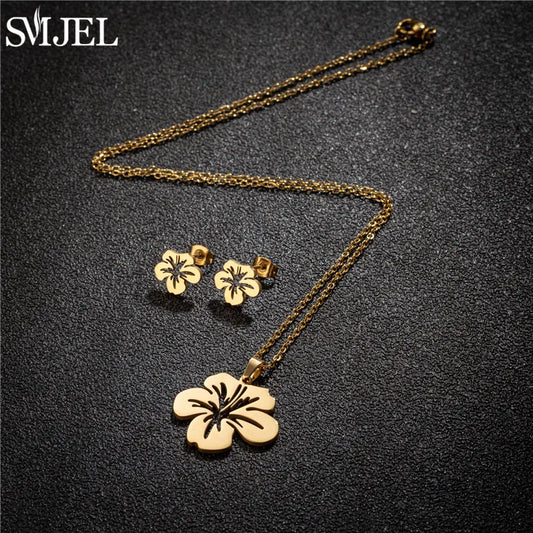 Stainless Steel Lily Flower Necklace Women Girls Golden Jewelry Sets Trendy Datura Cherry Blossom Earrings Wedding Gift